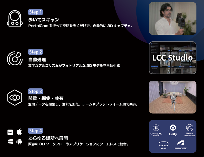 PortalCamは、革新的な3D Gaussian Splatting技術を用いて、現実をインタラクティブな3D環境としてとらえる世界初のハンドヘルド型デバイスです。