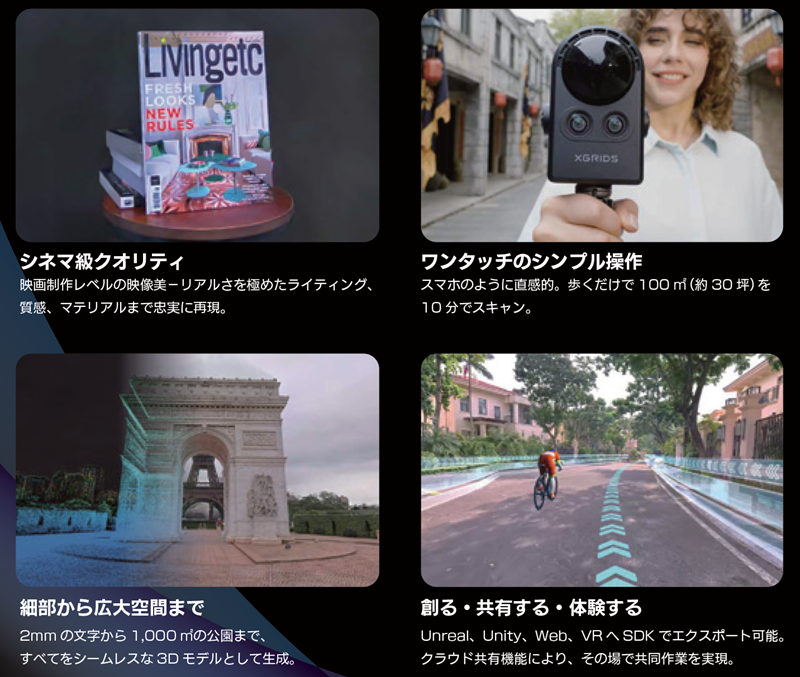 LiDARと4基のカメラアレイ、さらに自動処理を融合することで、現実をフォトリアルな空間モデルとして再現。ユーザーはその中を歩き回り、自由に編集し、さまざまなプラットフォームで共有できます。